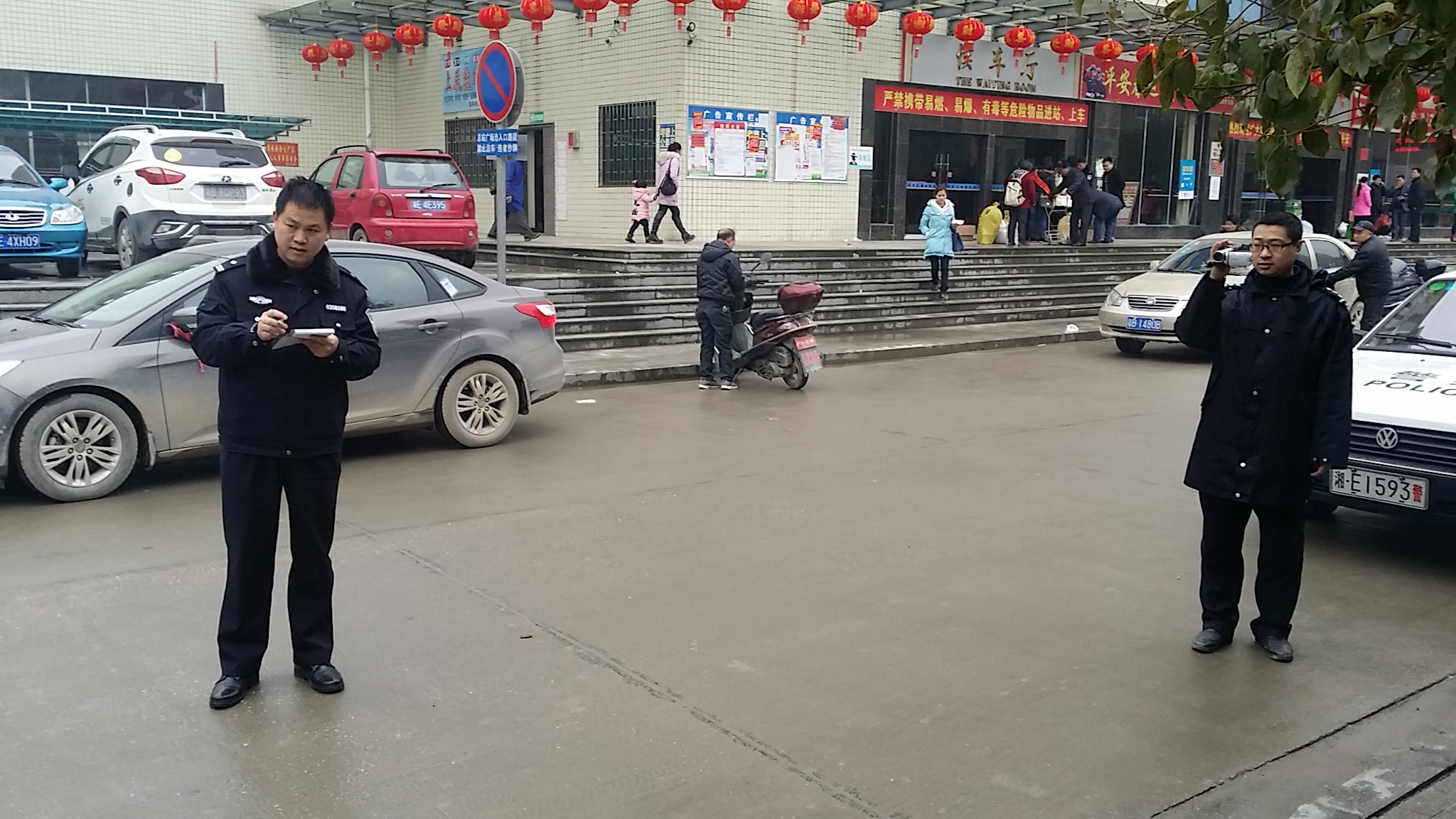 圖為湘運(yùn)集團(tuán)洞口客運(yùn)分公司稽查保衛(wèi)科工作人員配合交警部門(mén)對(duì)亂停亂擺車(chē)輛進(jìn)行抄牌錄像。